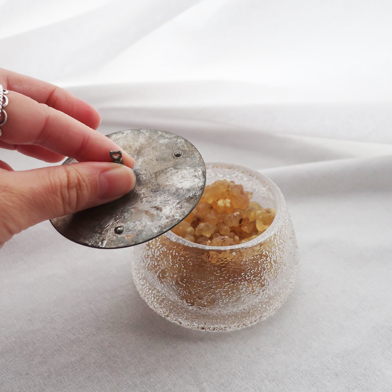 ガラスに乳香の天然樹脂をころりと入れて、日々、2,3滴の精油を垂らして馴染ませ、空間に香りを漂わせます。
