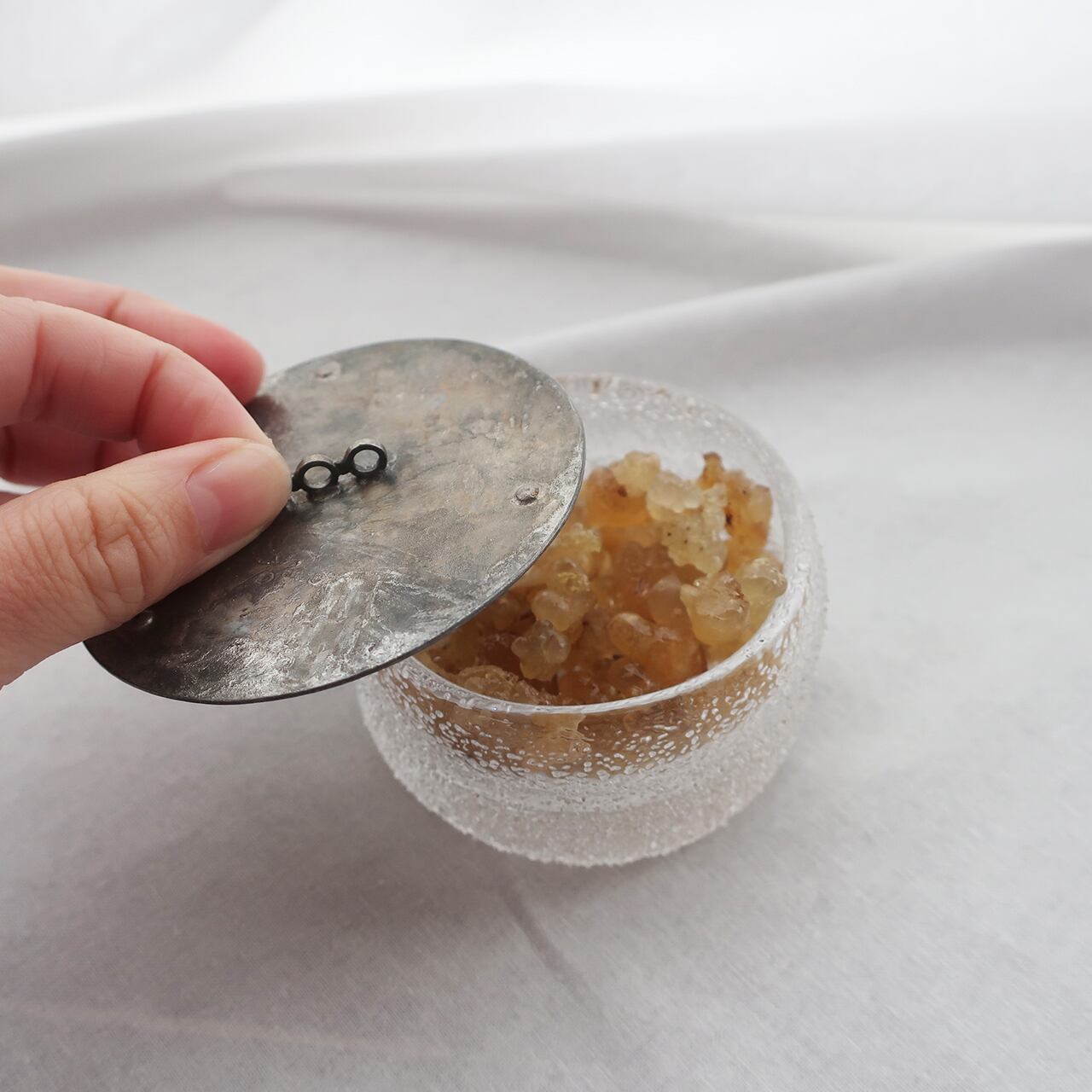 ガラスに乳香の天然樹脂をころりと入れて、日々、2,3滴の精油を垂らして馴染ませ、空間に香りを漂わせます。