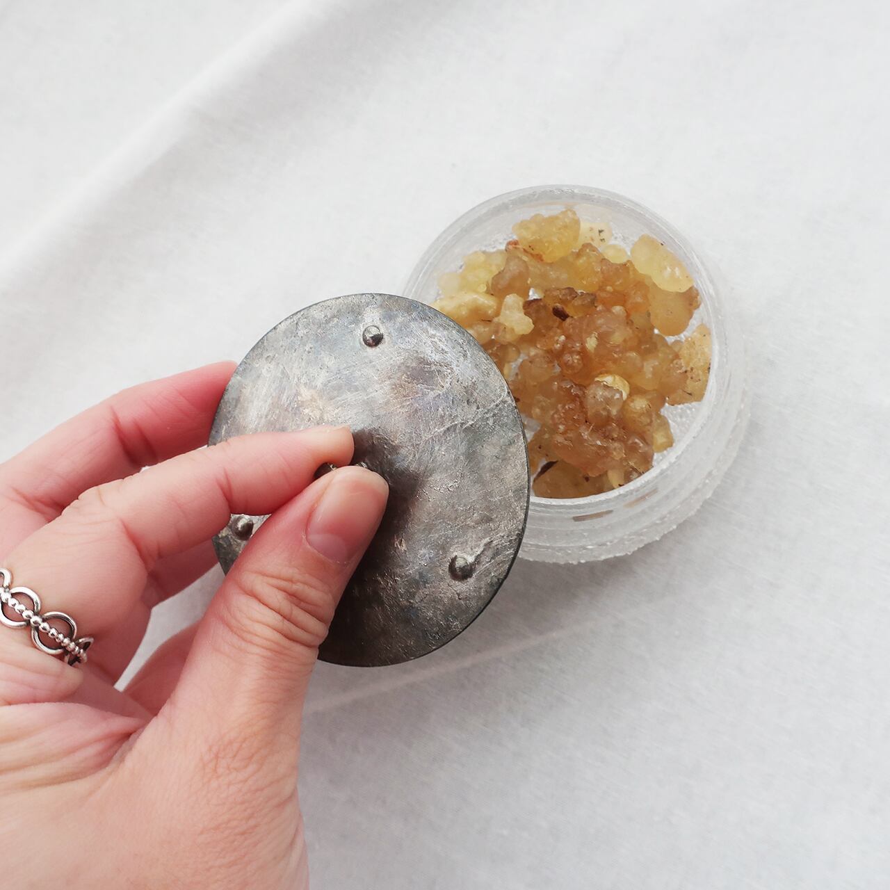 ガラスに乳香の天然樹脂をころりと入れて、日々、2,3滴の精油を垂らして馴染ませ、空間に香りを漂わせます。