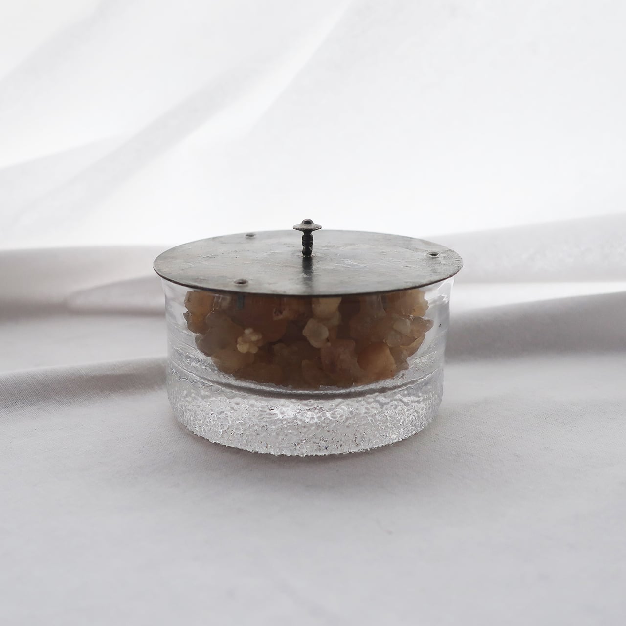 ガラスに乳香の天然樹脂をころりと入れて、日々、2,3滴の精油を垂らして馴染ませ、空間に香りを漂わせます。